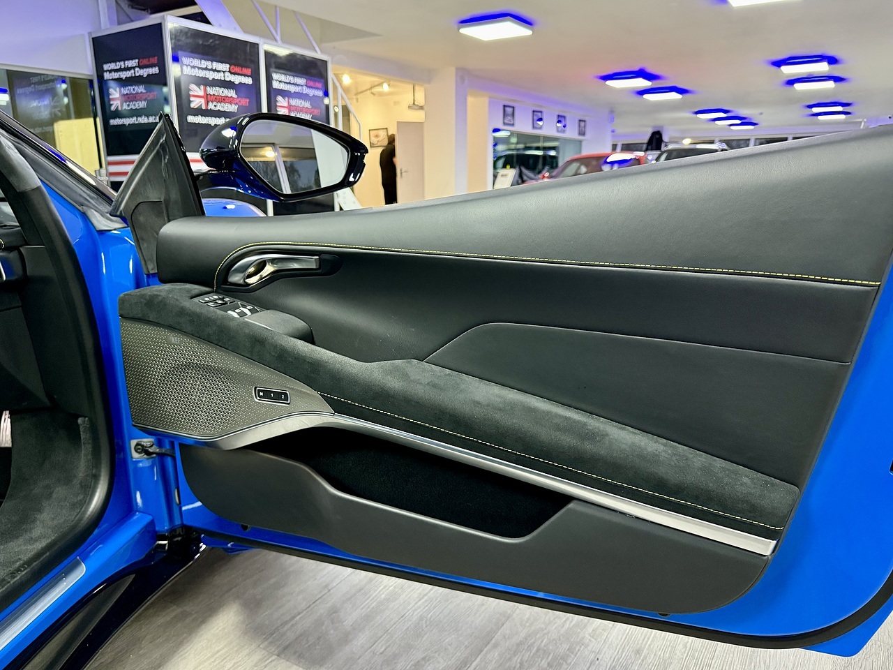 The interior of the car in the in the black alcantara with yellow stitching, has an alcantara steering wheel.
