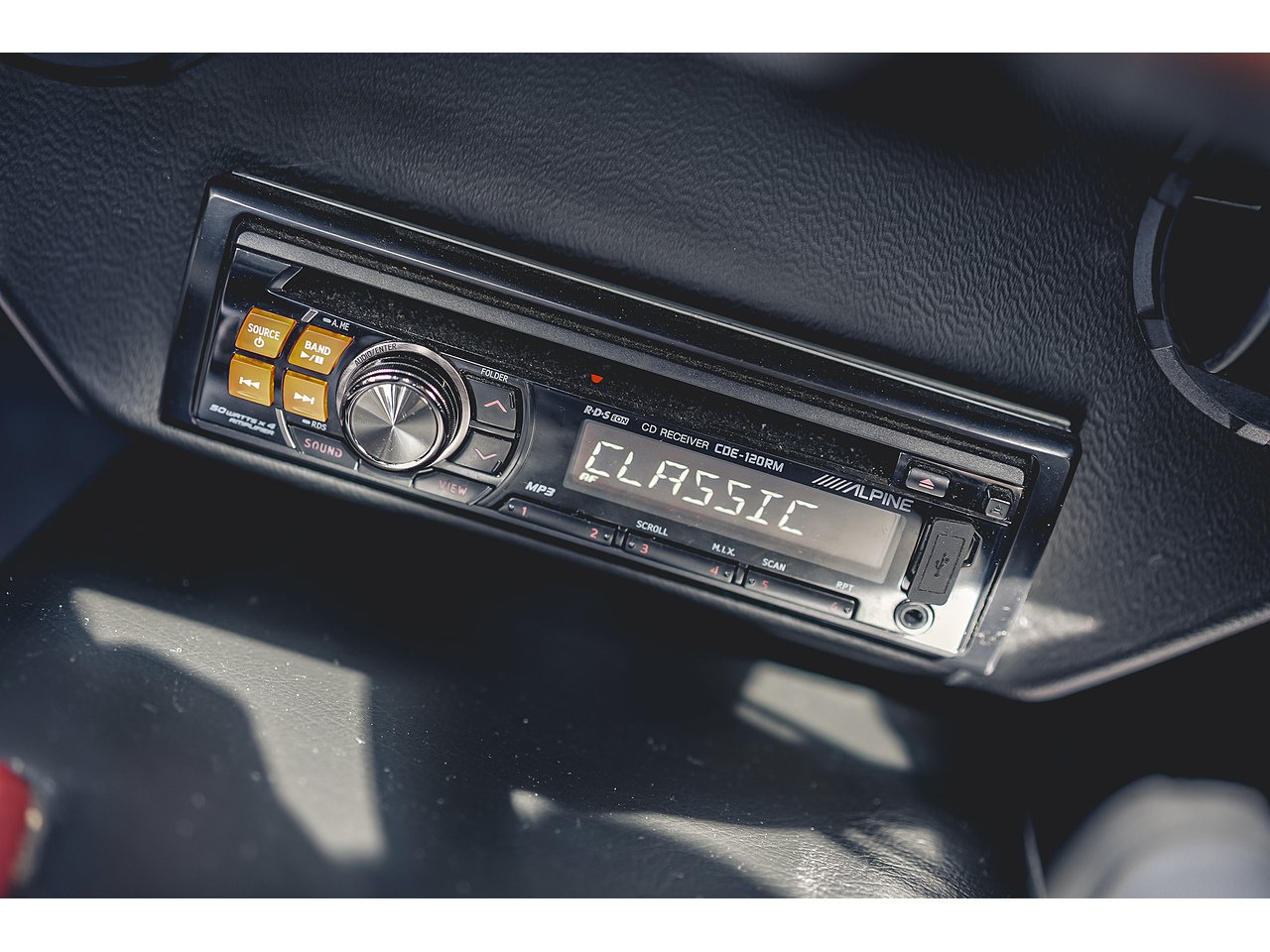 The interior of the car comes in black leather with red piping. It also has a walnut dashboard with a gloss veneer. It comes with a radio fitted, fully functioning air conditioning and 2 USB ports.